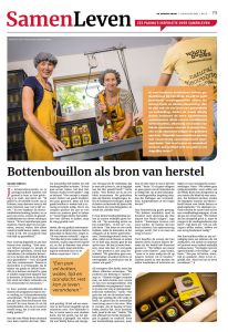 In hun kleine bouillonfabriekje koken de zussen wekelijks grote ketels vol. “Op woensdag zetten we het rundervlees- en bot op”, vertelt Karin. “Dat laten we een nacht trekken, zodat de mineralen en het collageen uit de botten goed loskomen. Donderdagochtend zeven we alles, vullen we de flessen en zetten we ze koel weg. Daarna gaat de kip op het vuur. Die kun je korter brouwen, maar ook daar zit veel goeds in.” Het product is met zorg ontwikkeld. “We gebruiken geen rare, kunstmatige smaakversterkers en toevoegingen. Je proeft puur wat de natuur ons geeft.”