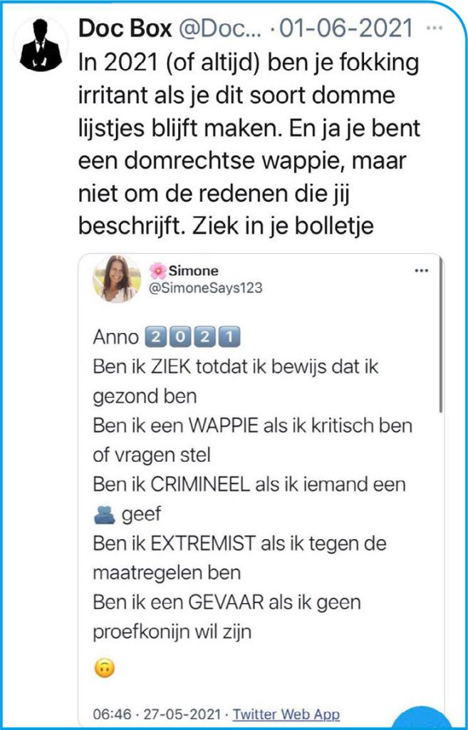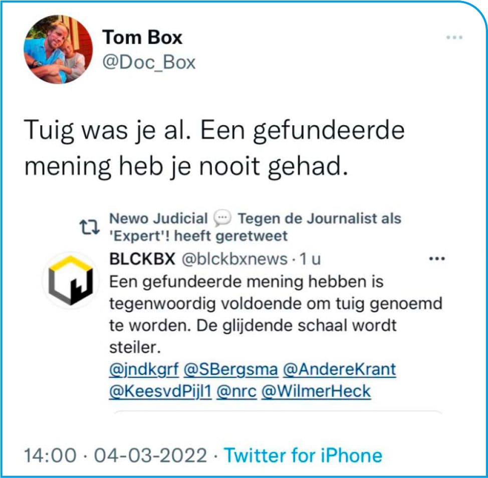 Hans van Tellingen is retailspecialist en heeft op Twitter inmiddels zo’n 72.000 volgers. Hans is iemand die altijd inhoudelijke en onderbouwde blogs schrijft en netjes blijft qua taalgebruik. Van alle coronabeleidscritici behoort hij zeker tot de “gematigden”. Van Tellingen: “Met Tom van Boxsel alias Tom Box aka Doc_Box heb ik een jaar of twee geleden voor het eerst kennisgemaakt. Eerst was hij nog anoniem op Twitter, maar later bleek hij een radioloog te zijn die zich liet omscholen tot huisarts in opleiding. Nu ben ik wel wat gewend op Twitter, maar zijn keiharde toon was echt opvallend te noemen. Dat had hij bijvoorbeeld naar mij toe. Maar met name zijn beschimpende en soms zelfs agressieve toon richting vrouwen als huisarts Els van Veen, @evareports, ON-presentatrice Raisa Blommestijn en Simone Juffermans was buitenproportioneel. Verder bleek hij vreemd genoeg te beschikken over een enorm grote groep meestal anonieme volgers die er dan in de commentaren nog een schepje bovenop deden bij Tom. Van Boxsel heeft hen bij mijn weten nooit tot de orde geroepen. Wat hij en zijn volgers aan online ‘verharding’ doen is ongekend. Dat hij op de voorste rij zat bij Kaag op 15 januari is voor mij dan ook hallucinant te noemen.”