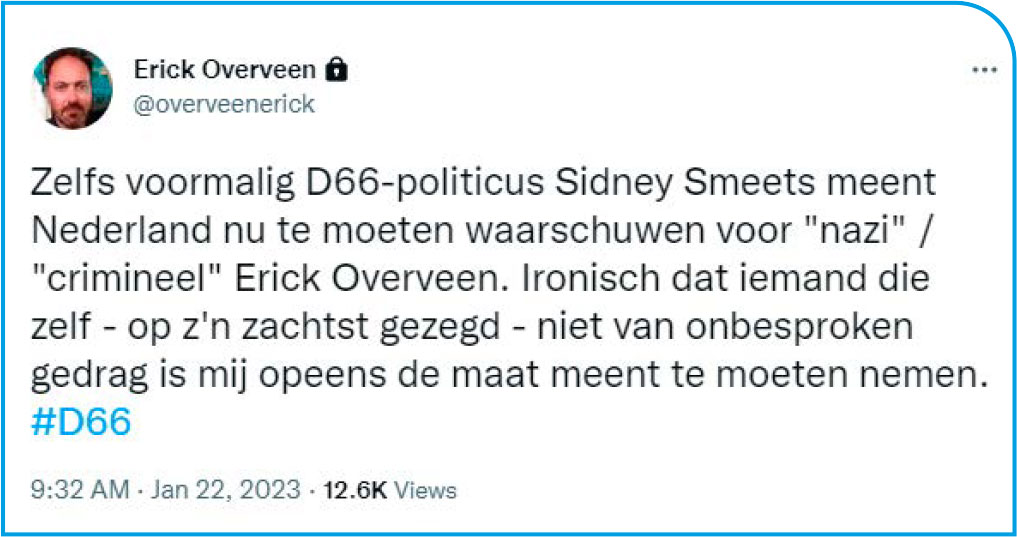 Nadat ik naar aanleiding van de D66-partijbijeenkomst me kritisch uit op Twitter, krijg ik direct van onder anderen D66’er Jan Paternotte en voormalig D66-lid Sydney Smeets een veeg uit de pan: “stop de terroristische tweets van opruier en crimineel Erick Overveen.”