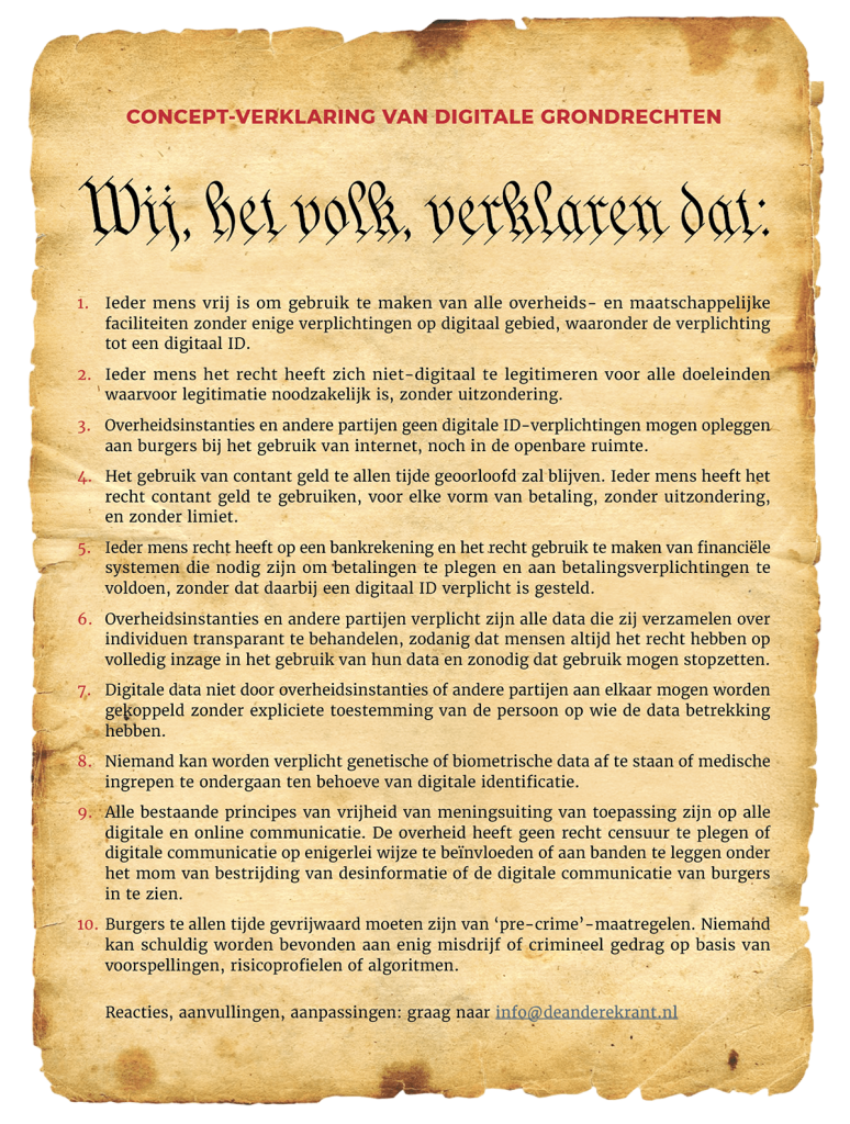 De Andere Krant heeft eind vorige maand een campagne gelanceerd tegen het digitale ID. Wij willen het publiek ervan overtuigen niet mee te werken aan enige vorm van ‘digitale identiteit’. Tegelijk willen we ervoor zorgen dat er een wet komt waarin de rechten van de mens zijn vastgelegd in het digitale domein. Hiervoor hebben we een Verklaring van digitale rechten opgesteld die de basis moet vormen voor een wetsvoorstel.